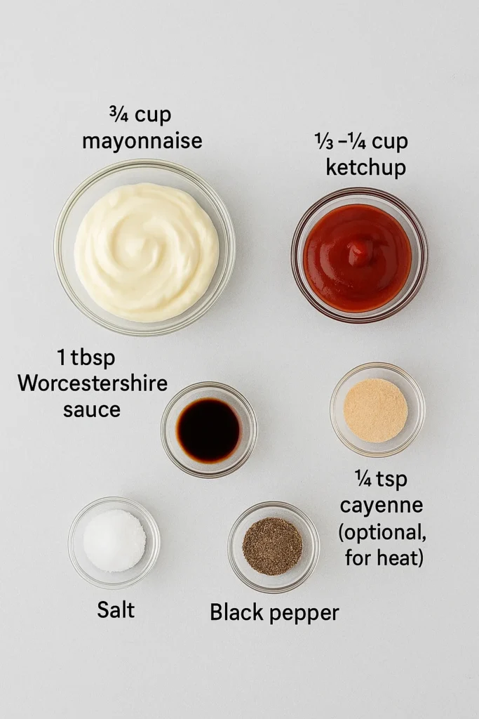 I whisk mayo, ketchup, Worcestershire sauce, garlic powder, onion powder, cayenne, salt, and pepper into a bowl. Then I chill it—it tastes best cold!